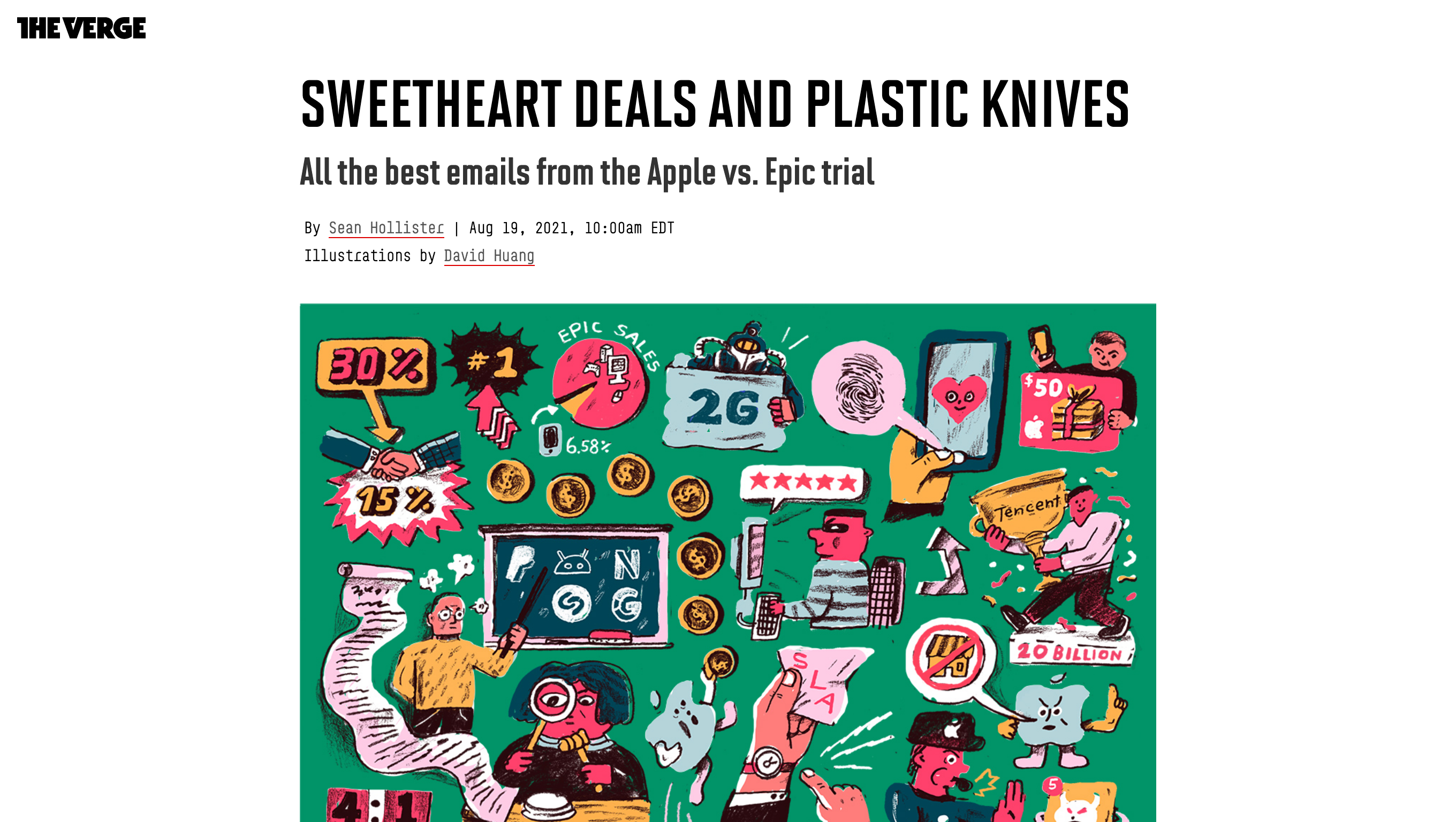 While we all waited for a verdict in Epic v. Apple, we created a giant collection of things we learned from their emails, including Apple’s lackluster App Store enforcement, Epic’s Fortnite trap, and 107 other tidbits. Given the density of the content, I built an interactive page to allow readers to get a macro view of our findings, letting them expand on the topics that they might find most interesting.