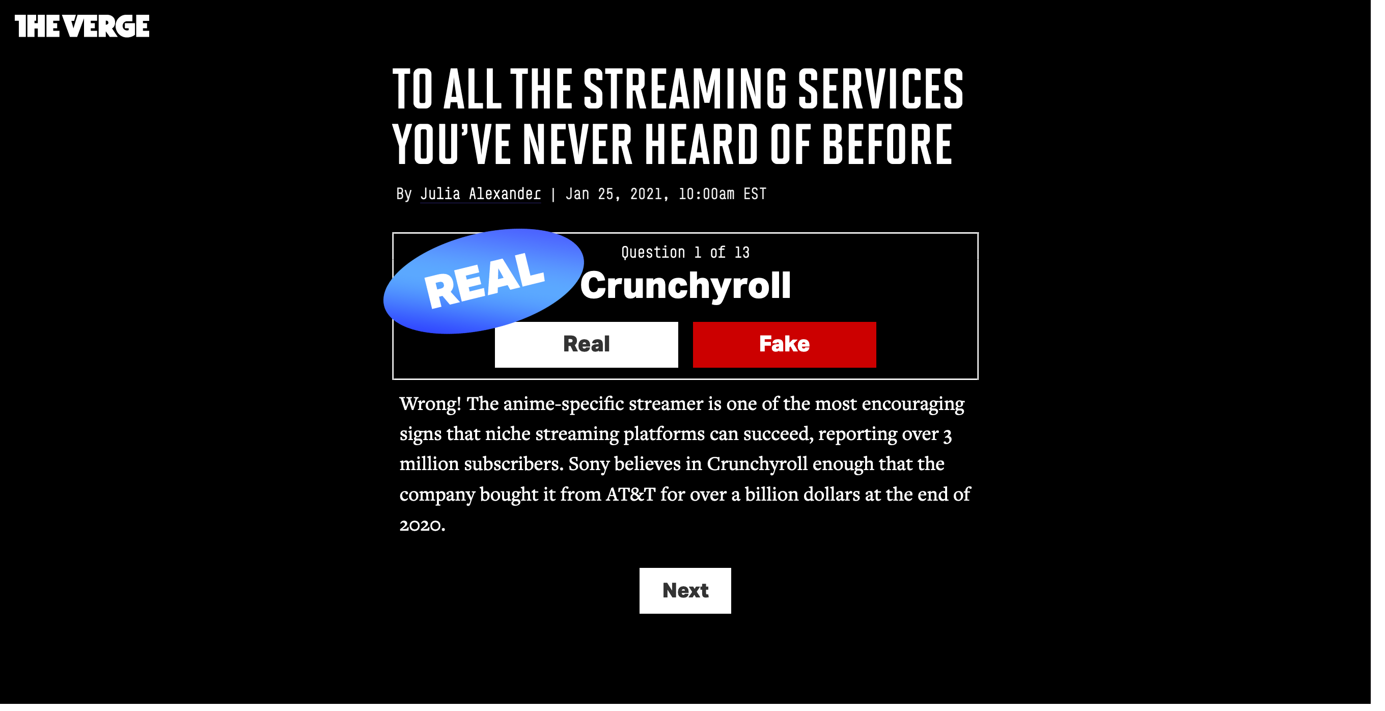 Streaming services like Disney Plus, HBO Max, and Netflix are household names, but what about smaller niche platforms? In a streaming-focused world, some of the biggest bets aren’t the best known. We built a quiz to test our readers ability to suss out the real from the fake streaming services.